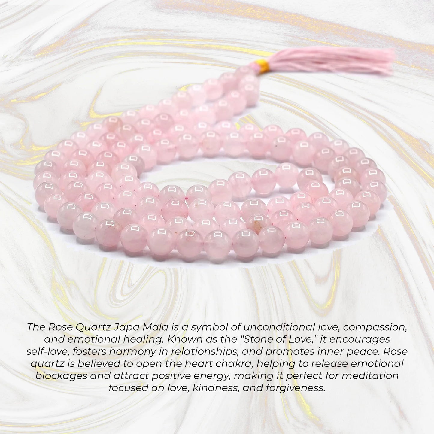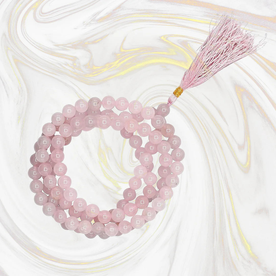 The Rose Quartz Japa Mala is designed to open the heart and bring love, compassion, and emotional healing to your practice. Known as the stone of love, rose quartz promotes self-love, forgiveness, and inner peace. This mala is perfect for meditation, affirmations, or as a gentle reminder of kindness and positivity in daily life.