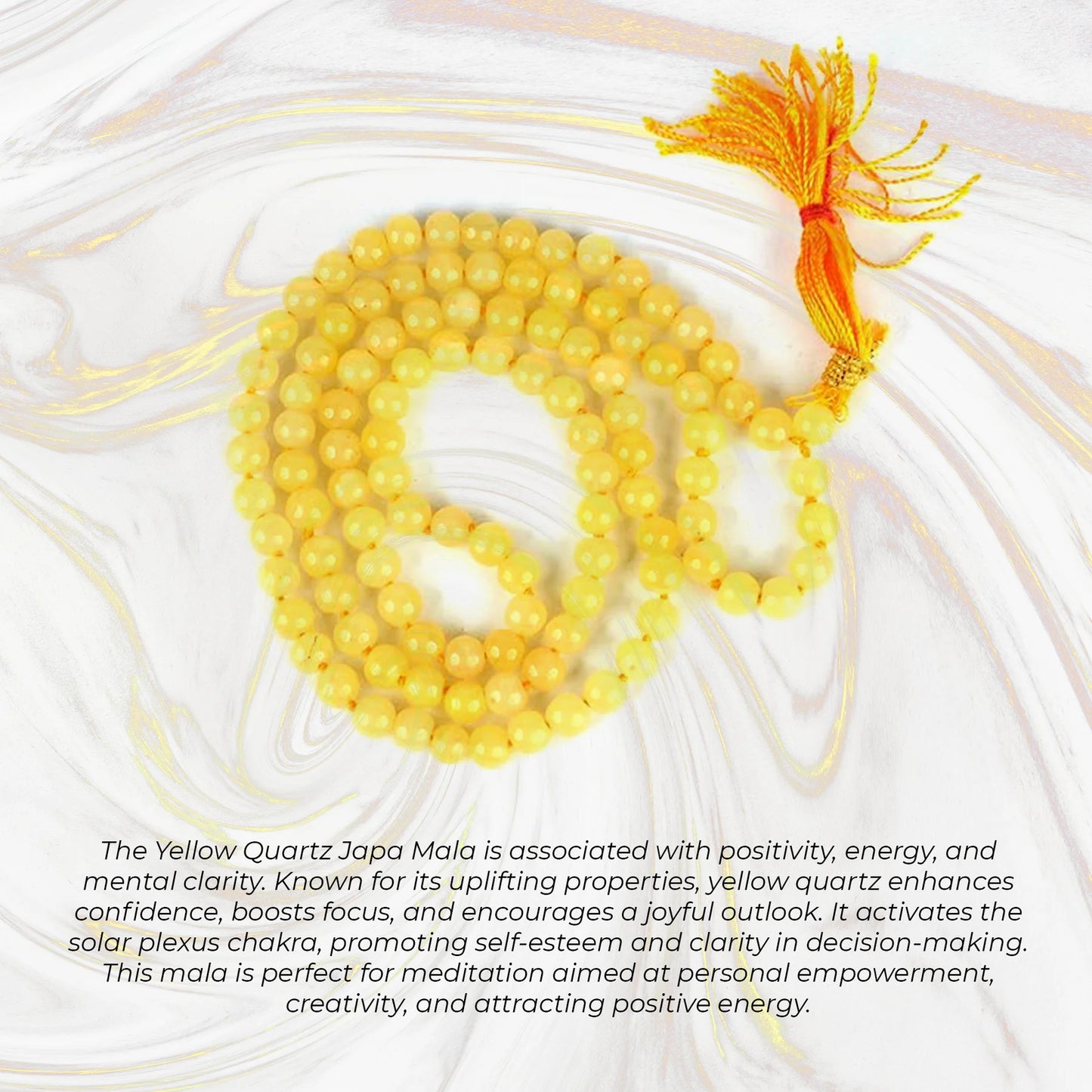 The Yellow Quartz Japa Mala is designed to bring positivity, confidence, and mental clarity to your spiritual practice. Known for its uplifting energy, yellow quartz enhances focus and motivation, making it ideal for meditation, prayer, or affirmations. This mala is crafted with care, each bead representing a step toward mindfulness and inner peace.